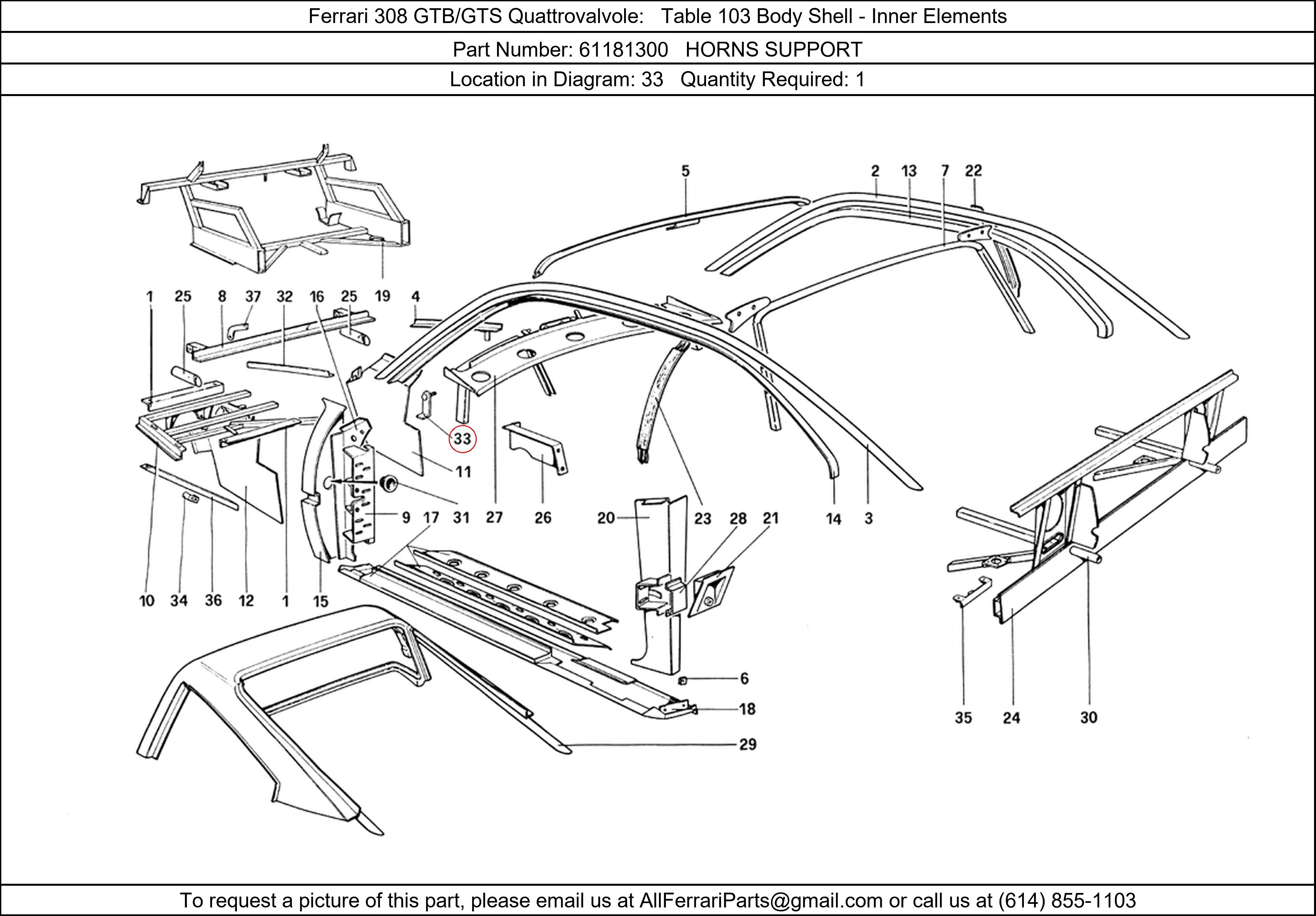 Ferrari Part Number 61181300, HORNS SUPPORT shown here as used in Ferrari 308 GTB/GTS Quattrovalvole Table 103 Body Shell - Inner Elements. Location in Diagram: 33. Required Quantity: 1