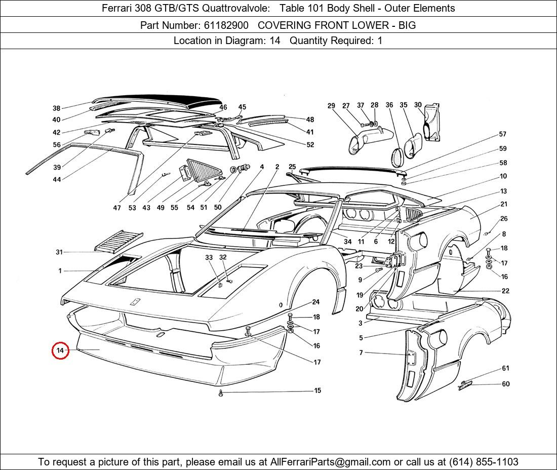Ferrari Part Number 61182900, COVERING FRONT LOWER - BIG shown here as used in Ferrari 308 GTB/GTS Quattrovalvole Table 101 Body Shell - Outer Elements. Location in Diagram: 14. Required Quantity: 1