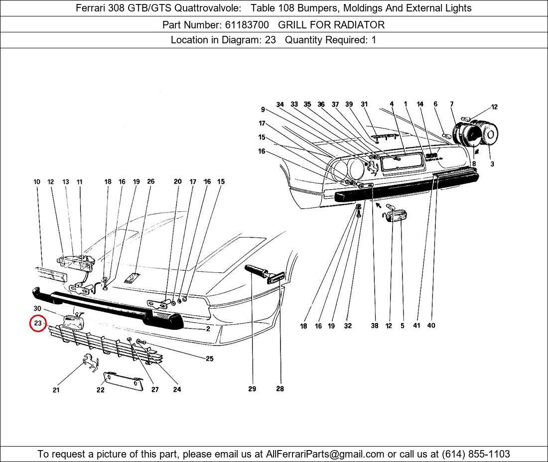 Ferrari Part Number 61183700, GRILL FOR RADIATOR shown here as used in Ferrari 308 GTB/GTS Quattrovalvole Table 108 Bumpers, Moldings And External Lights. Location in Diagram: 23. Required Quantity: 1