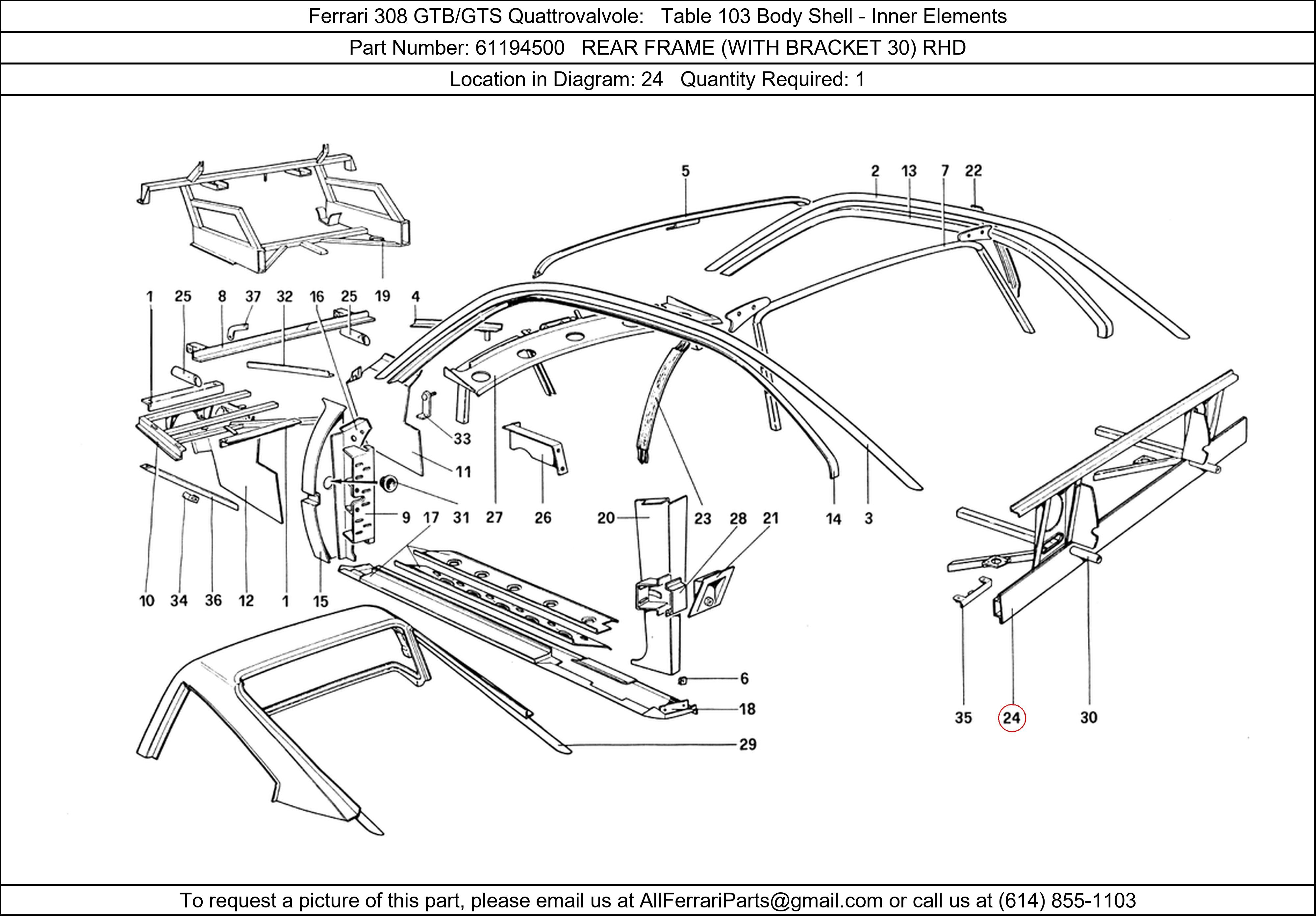 Ferrari Part Number 61194500, REAR FRAME (WITH BRACKET 30) RHD shown here as used in Ferrari 308 GTB/GTS Quattrovalvole Table 103 Body Shell - Inner Elements. Location in Diagram: 24. Required Quantity: 1
