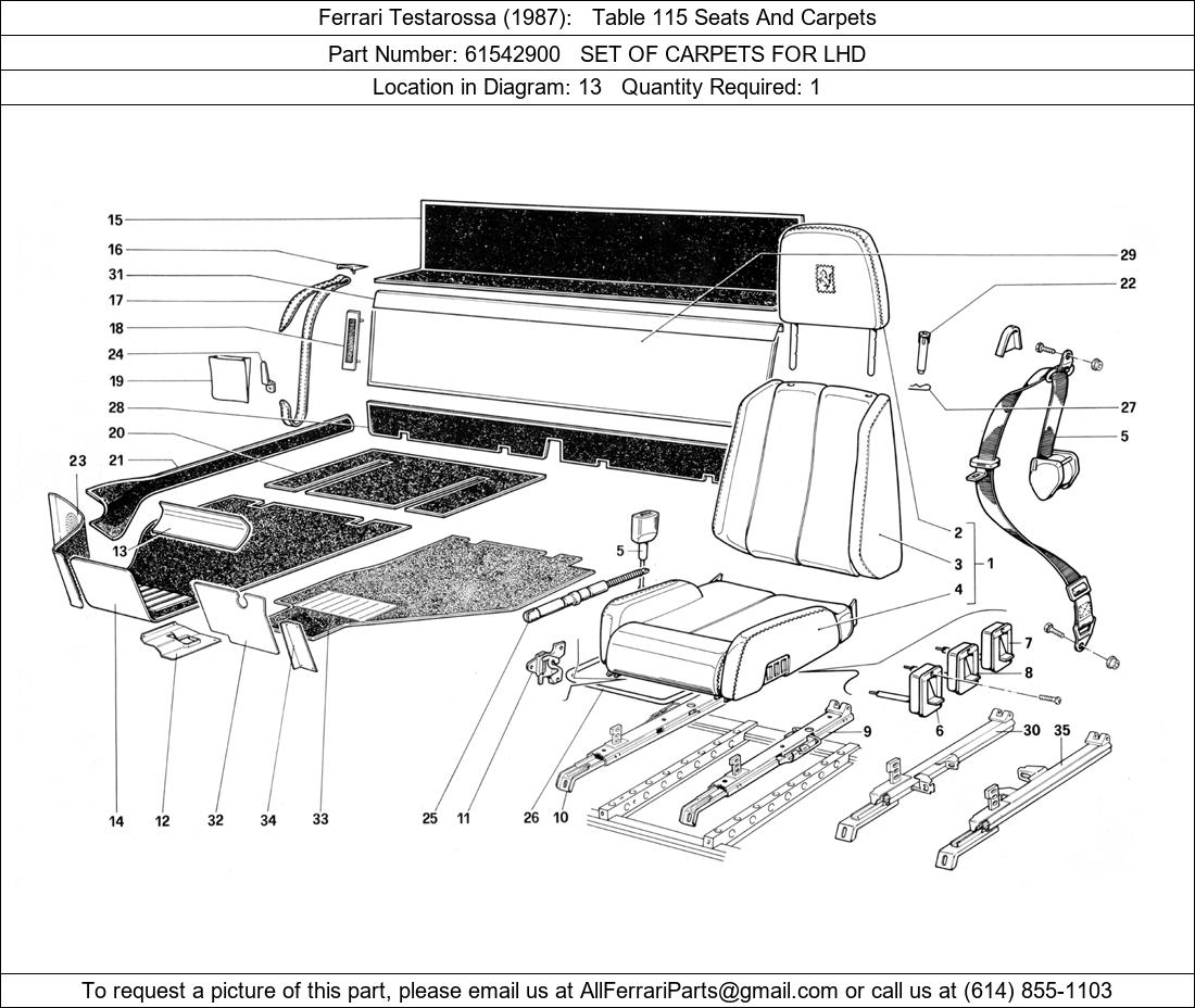Ferrari Part 61542900, SET OF CARPETS FOR LHD, shown here as used in Ferrari Testarossa (1987) Table 115 Seats And Carpets. Other uses of this part are shown below: