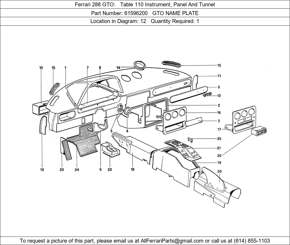 Ferrari Part 61596200, GTO NAME PLATE, shown here as used in Ferrari 288 GTO Table 110 Instrument, Panel And Tunnel.