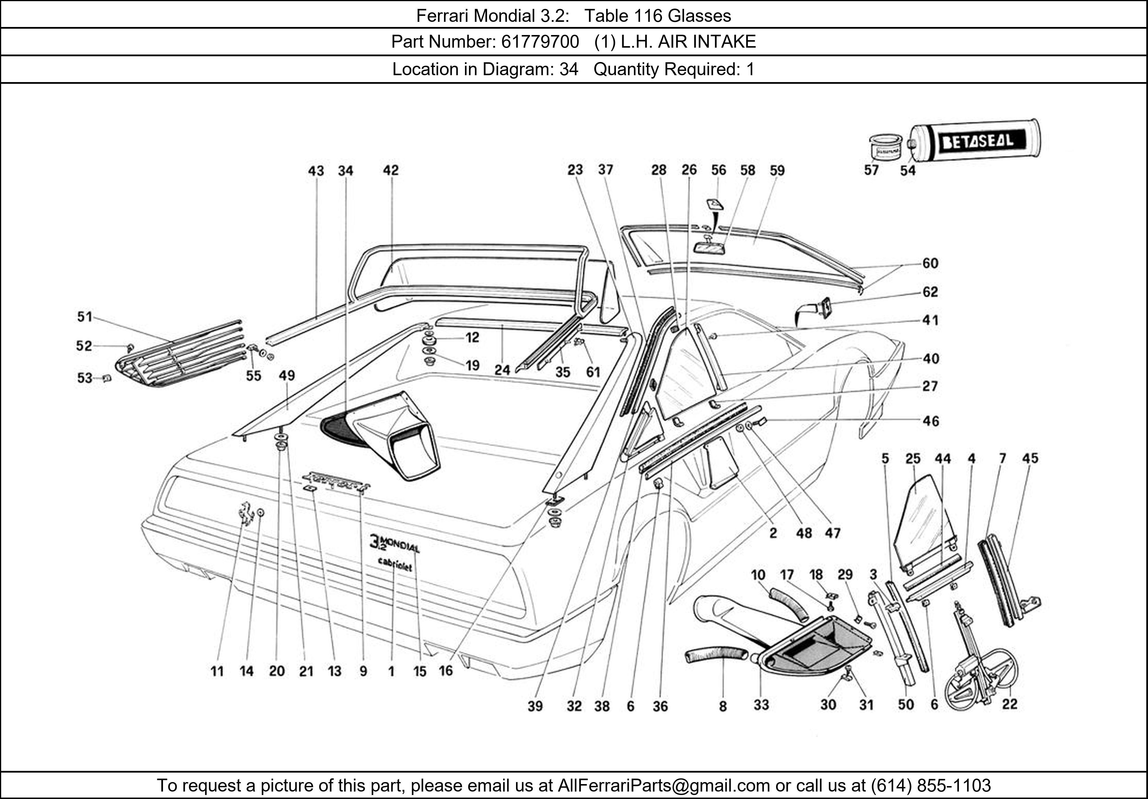 Ferrari Part 61779700, (1) L.H. AIR INTAKE, shown here as used in Ferrari Mondial 3.2 Table 116 Glasses.