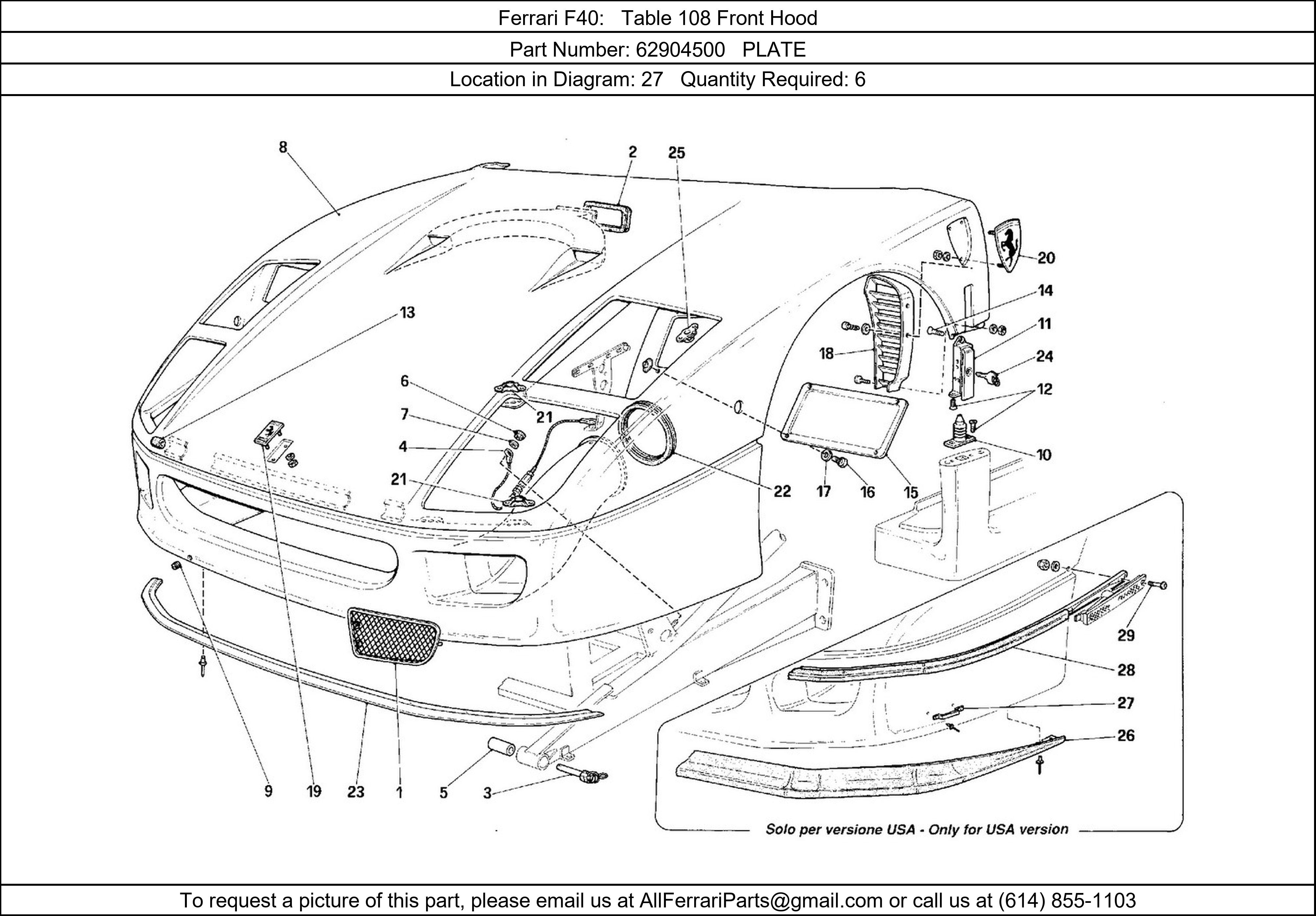 Ferrari Part 62904500, PLATE, shown here as used in Ferrari F40 Table 108 Front Hood.