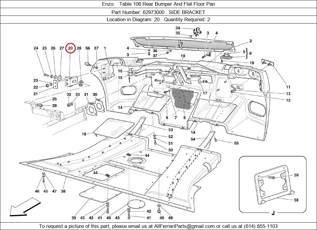 Ferrari Part Number 62973000, SIDE BRACKET shown here as used in Enzo Table 106 Rear Bumper And Flat Floor Pan. Location in Diagram: 20. Required Quantity: 2. This Ferrari part is used in more than one diagram. Click on the diagrams below to see alternative uses of this part: