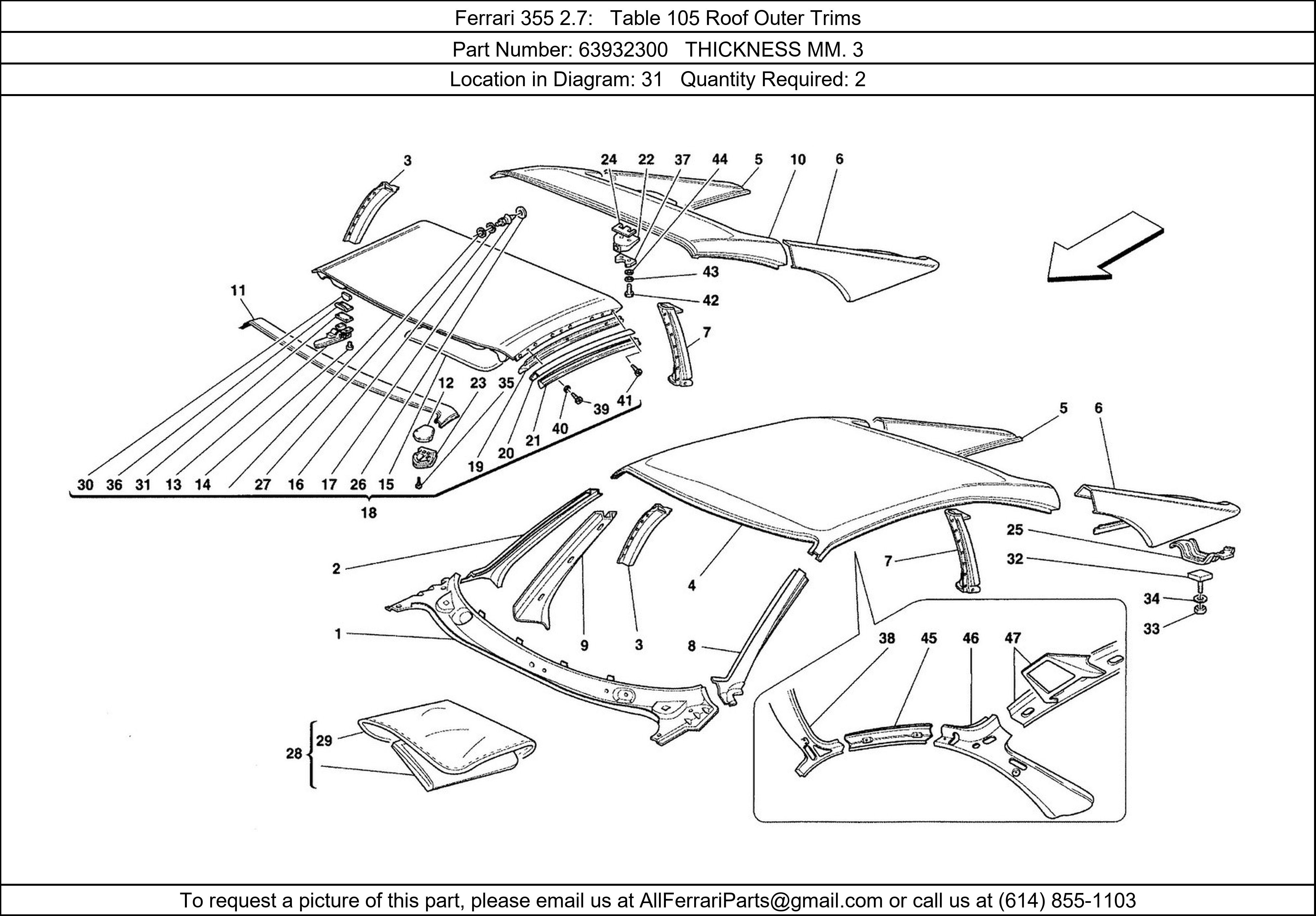 Ferrari Part 63932300, THICKNESS MM. 3, shown here as used in Ferrari 355 2.7 Table 105 Roof Outer Trims. Other uses of this part are shown below: