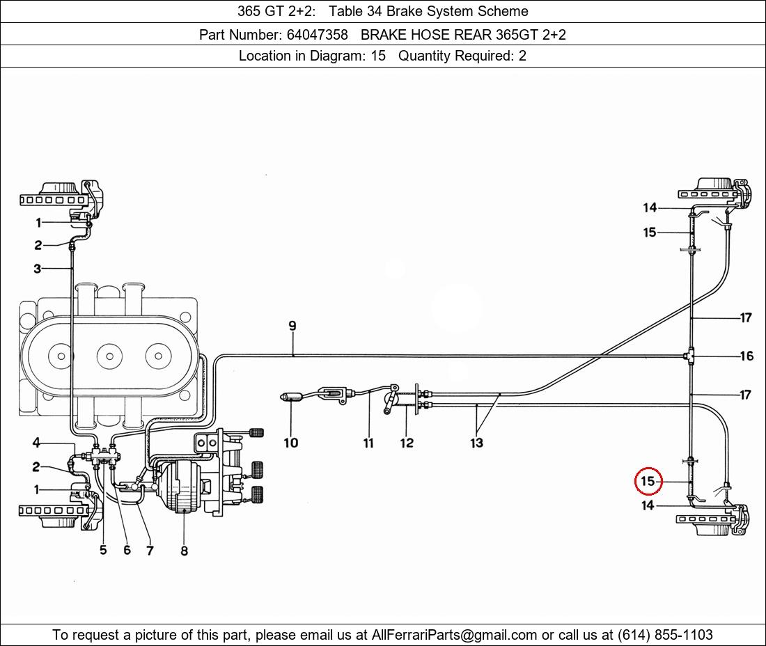 Ferrari Part Number 64047358, BRAKE HOSE REAR 365GT 2+2 shown here as used in 365 GT 2+2 Table 34 Brake System Scheme. Location in Diagram: 15. Required Quantity: 2. This Ferrari part is used in more than one diagram. Click on the diagrams below to see alternative uses of this part: