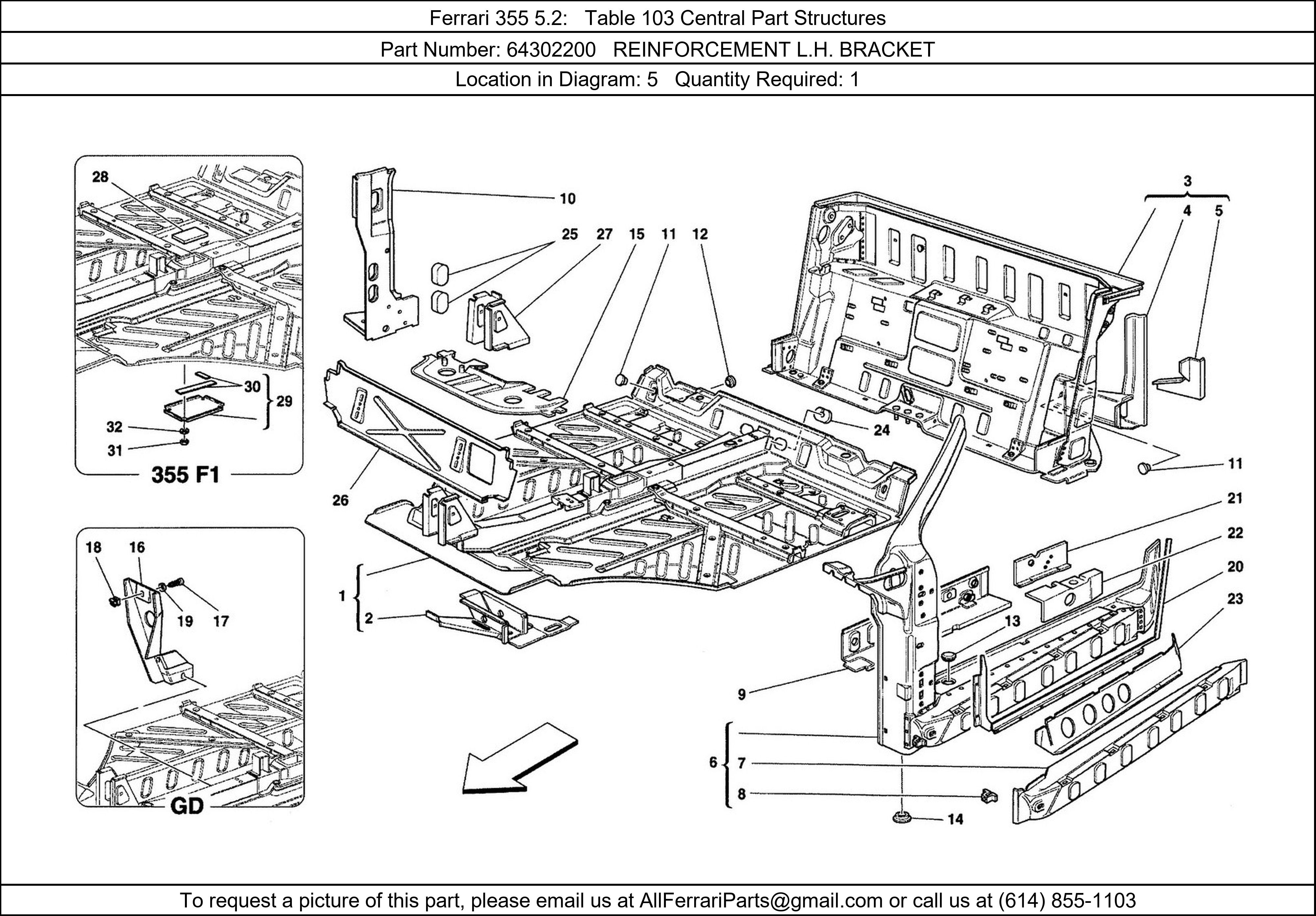 Ferrari Part 64302200, REINFORCEMENT L.H. BRACKET, shown here as used in Ferrari 355 5.2 Table 103 Central Part Structures. Other uses of this part are shown below: