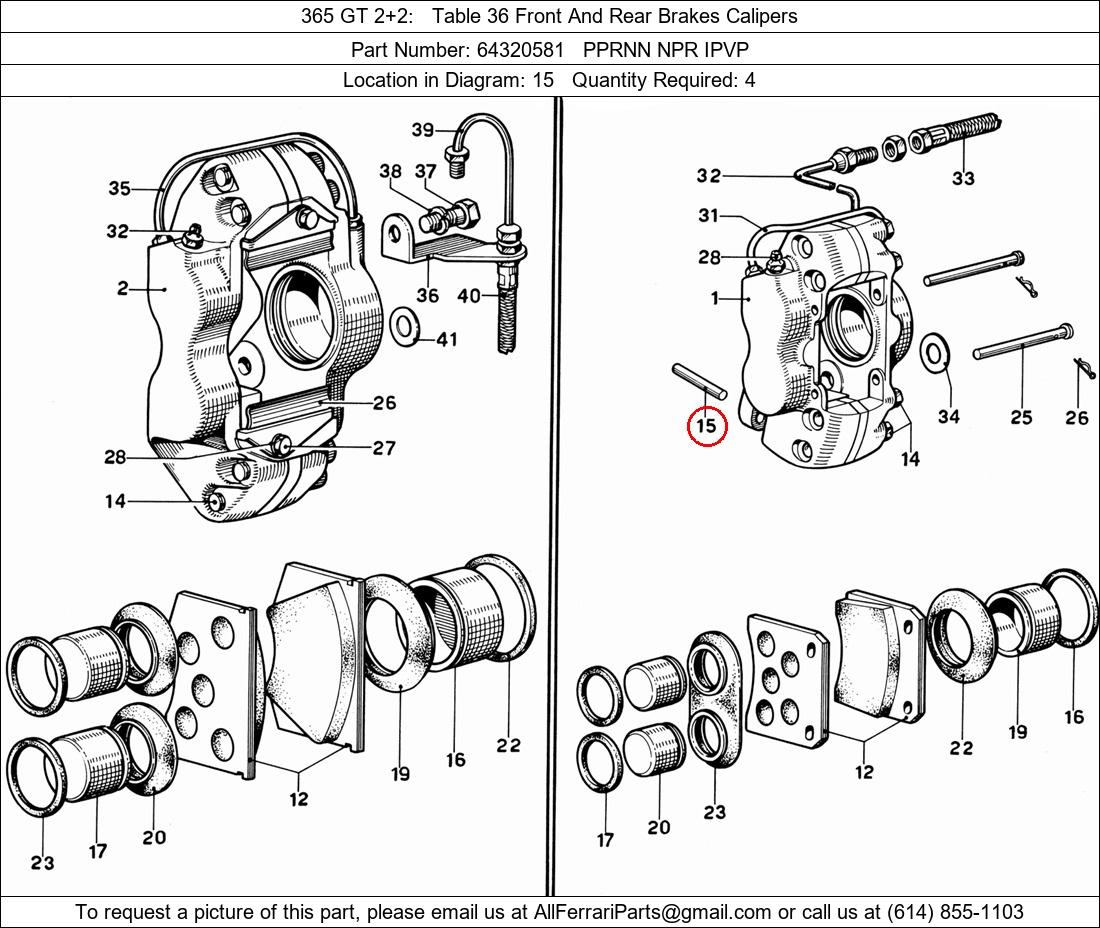 Ferrari Part Number 64320581, PPRNN NPR IPVP shown here as used in 365 GT 2+2 Table 36 Front And Rear Brakes Calipers. Location in Diagram: 15. Required Quantity: 4