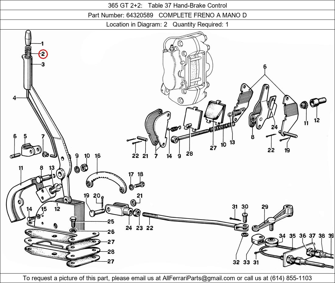 Ferrari Part Number 64320589, COMPLETE FRENO A MANO D shown here as used in 365 GT 2+2 Table 37 Hand-Brake Control. Location in Diagram: 2. Required Quantity: 1