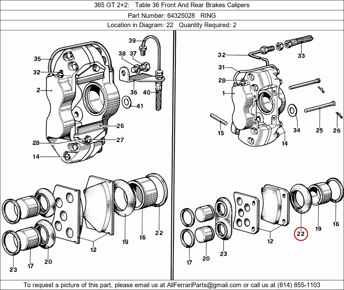 Ferrari Part Number 64325028, RING shown here as used in 365 GT 2+2 Table 36 Front And Rear Brakes Calipers. Location in Diagram: 22. Required Quantity: 2. This Ferrari part is used in more than one diagram. Click on the diagrams below to see alternative uses of this part: