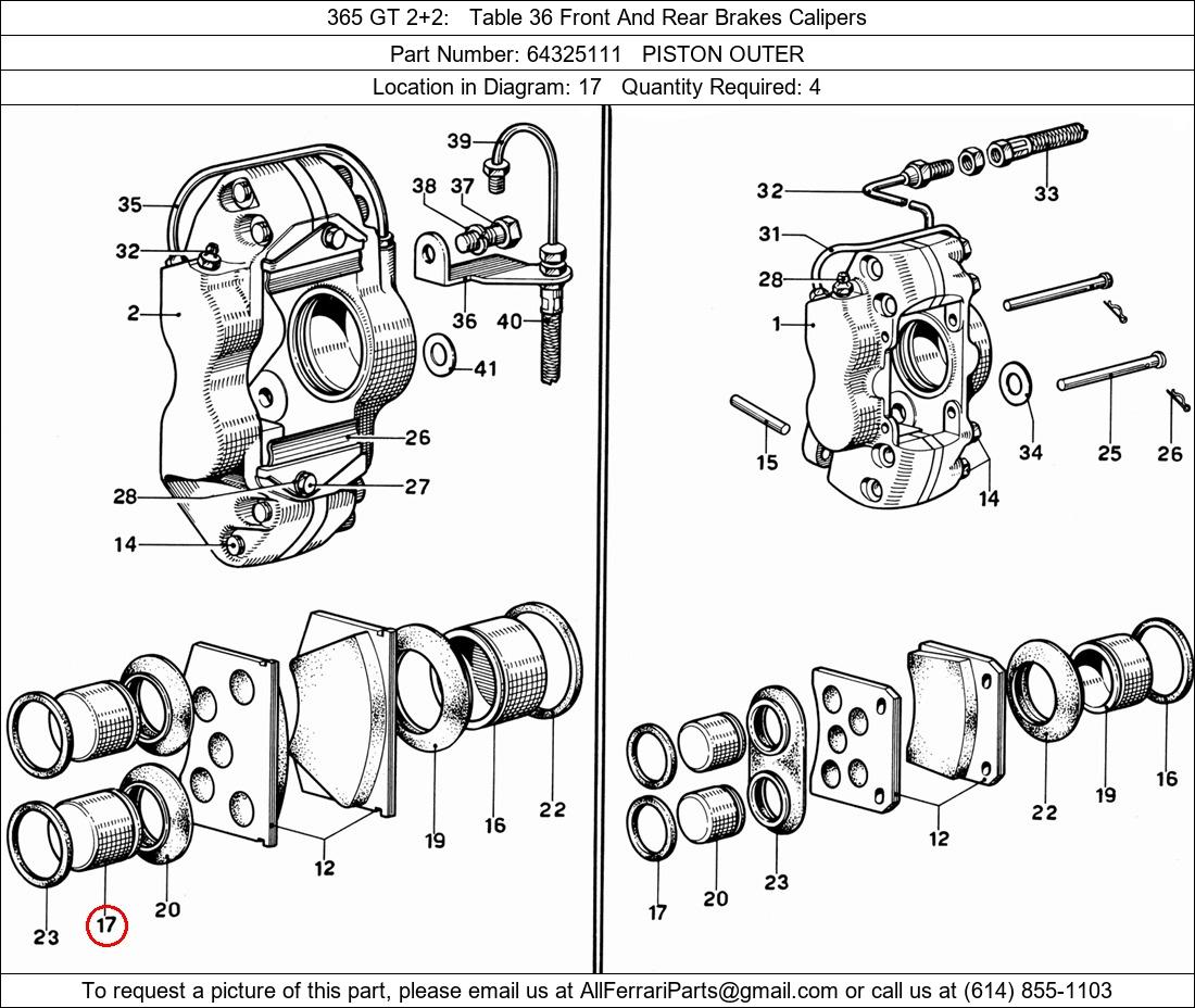Ferrari Part Number 64325111, PISTON OUTER shown here as used in 365 GT 2+2 Table 36 Front And Rear Brakes Calipers. Location in Diagram: 17. Required Quantity: 4