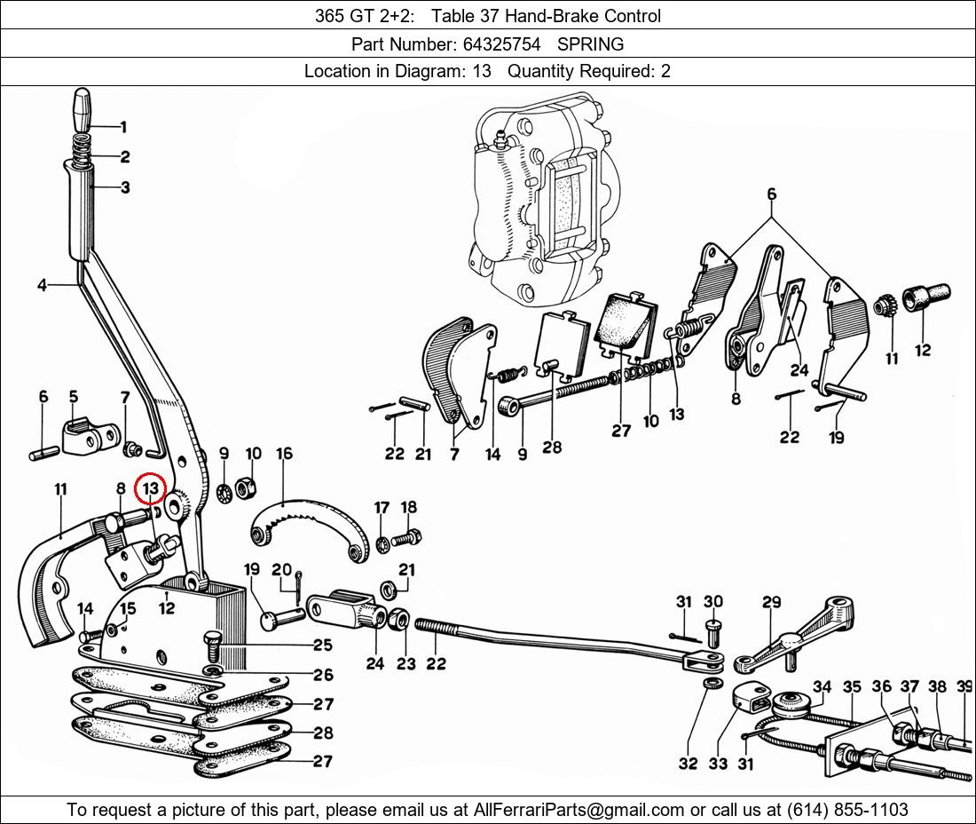 Ferrari Part Number 64325754, SPRING shown here as used in 365 GT 2+2 Table 37 Hand-Brake Control. Location in Diagram: 13. Required Quantity: 2