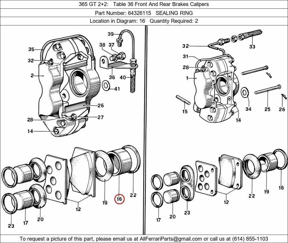 Ferrari Part Number 64326115, SEALING RING shown here as used in 365 GT 2+2 Table 36 Front And Rear Brakes Calipers. Location in Diagram: 16. Required Quantity: 2. This Ferrari part is used in more than one diagram. Click on the diagrams below to see alternative uses of this part: