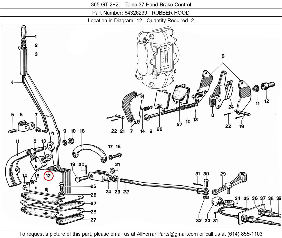 Ferrari Part Number 64326239, RUBBER HOOD shown here as used in 365 GT 2+2 Table 37 Hand-Brake Control. Location in Diagram: 12. Required Quantity: 2
