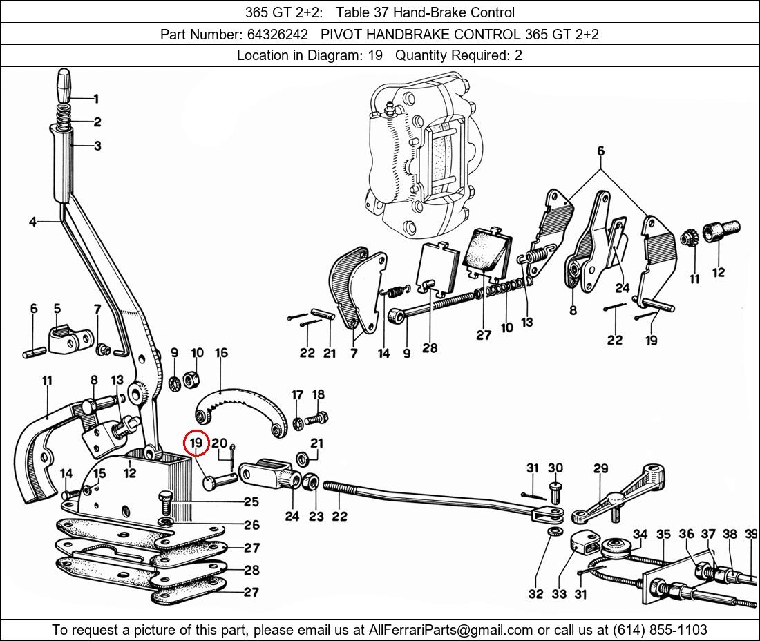 Ferrari Part Number 64326242, PIVOT HANDBRAKE CONTROL 365 GT 2+2 shown here as used in 365 GT 2+2 Table 37 Hand-Brake Control. Location in Diagram: 19. Required Quantity: 2