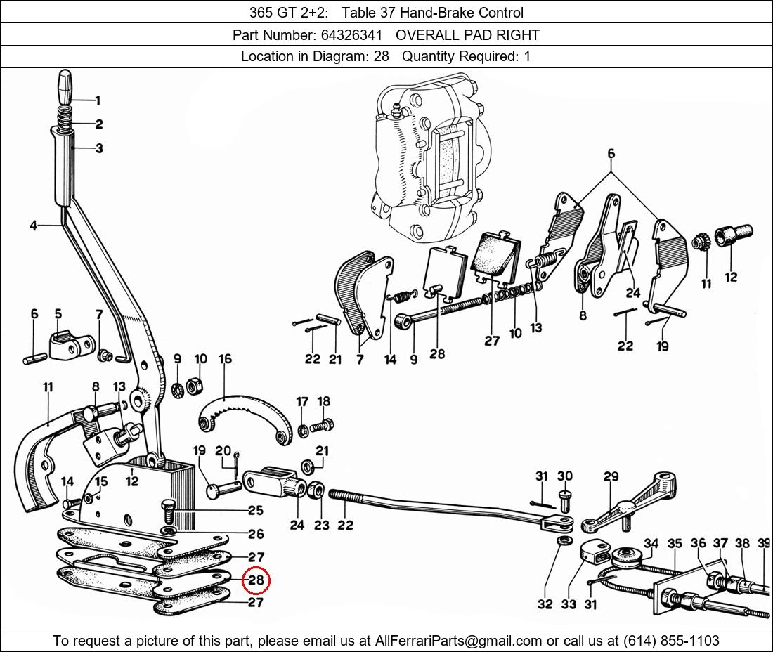Ferrari Part Number 64326341, OVERALL PAD RIGHT shown here as used in 365 GT 2+2 Table 37 Hand-Brake Control. Location in Diagram: 28. Required Quantity: 1