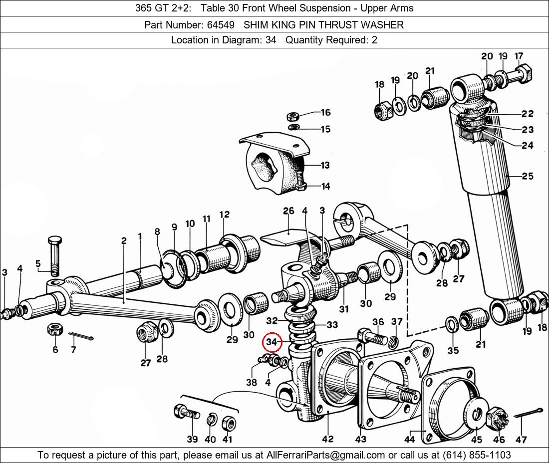Ferrari Part Number 64549, SHIM KING PIN THRUST WASHER shown here as used in 365 GT 2+2 Table 30 Front Wheel Suspension - Upper Arms. Location in Diagram: 34. Required Quantity: 2. This Ferrari part is used in more than one diagram. Click on the diagrams below to see alternative uses of this part: