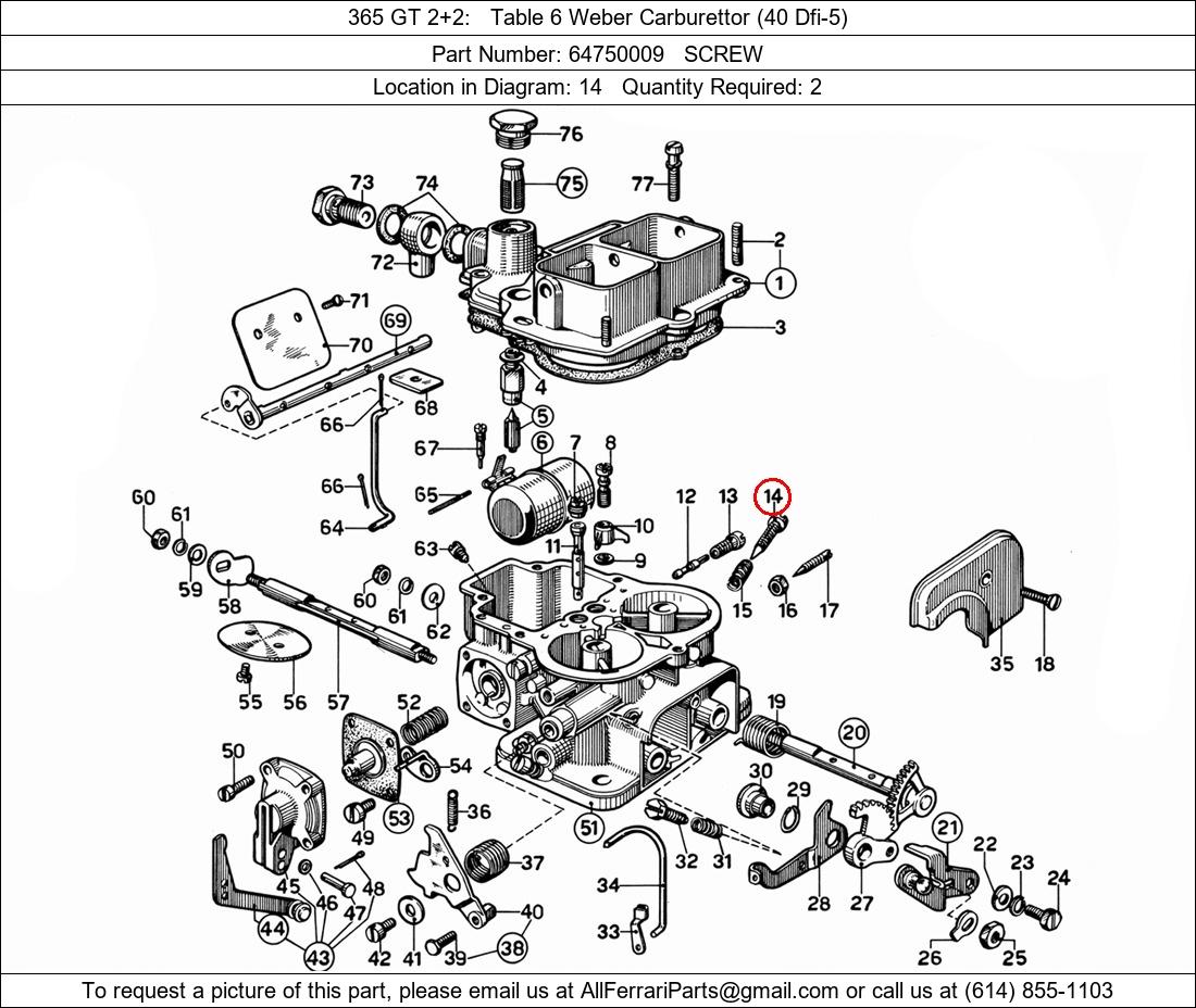 Ferrari Part Number 64750009, SCREW shown here as used in 365 GT 2+2 Table 6 Weber Carburettor (40 Dfi-5). Location in Diagram: 14. Required Quantity: 2
