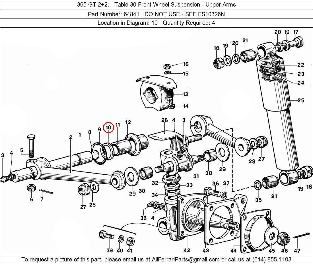 Ferrari Part Number 64841, DO NOT USE - SEE FS10326N shown here as used in 365 GT 2+2 Table 30 Front Wheel Suspension - Upper Arms. Location in Diagram: 10. Required Quantity: 4. This Ferrari part is used in more than one diagram. Click on the diagrams below to see alternative uses of this part: