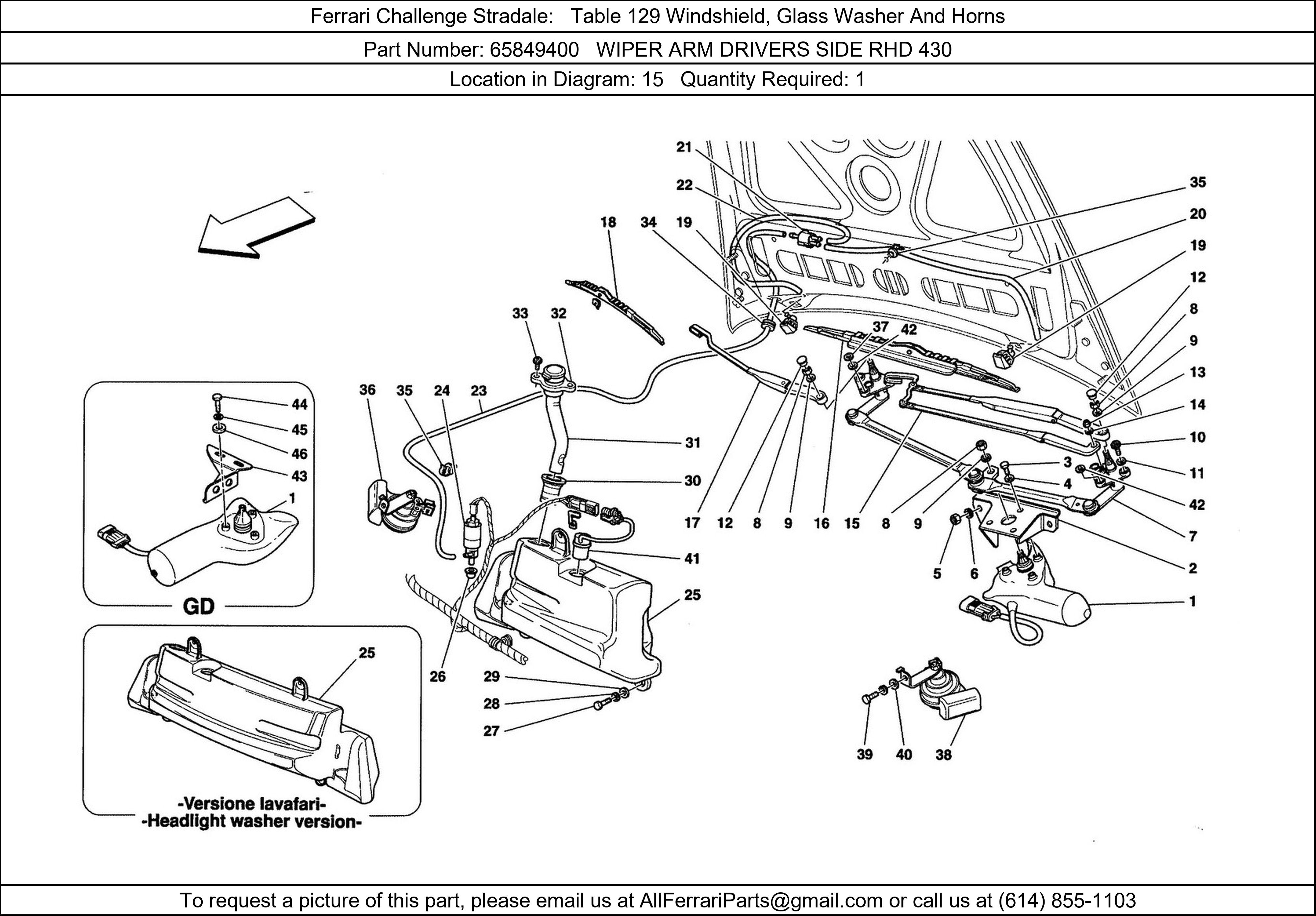 Ferrari Part 65849400, WIPER ARM DRIVERS SIDE RHD 430, shown here as used in Ferrari Challenge Stradale Table 129 Windshield, Glass Washer And Horns. Other uses of this part are shown below: