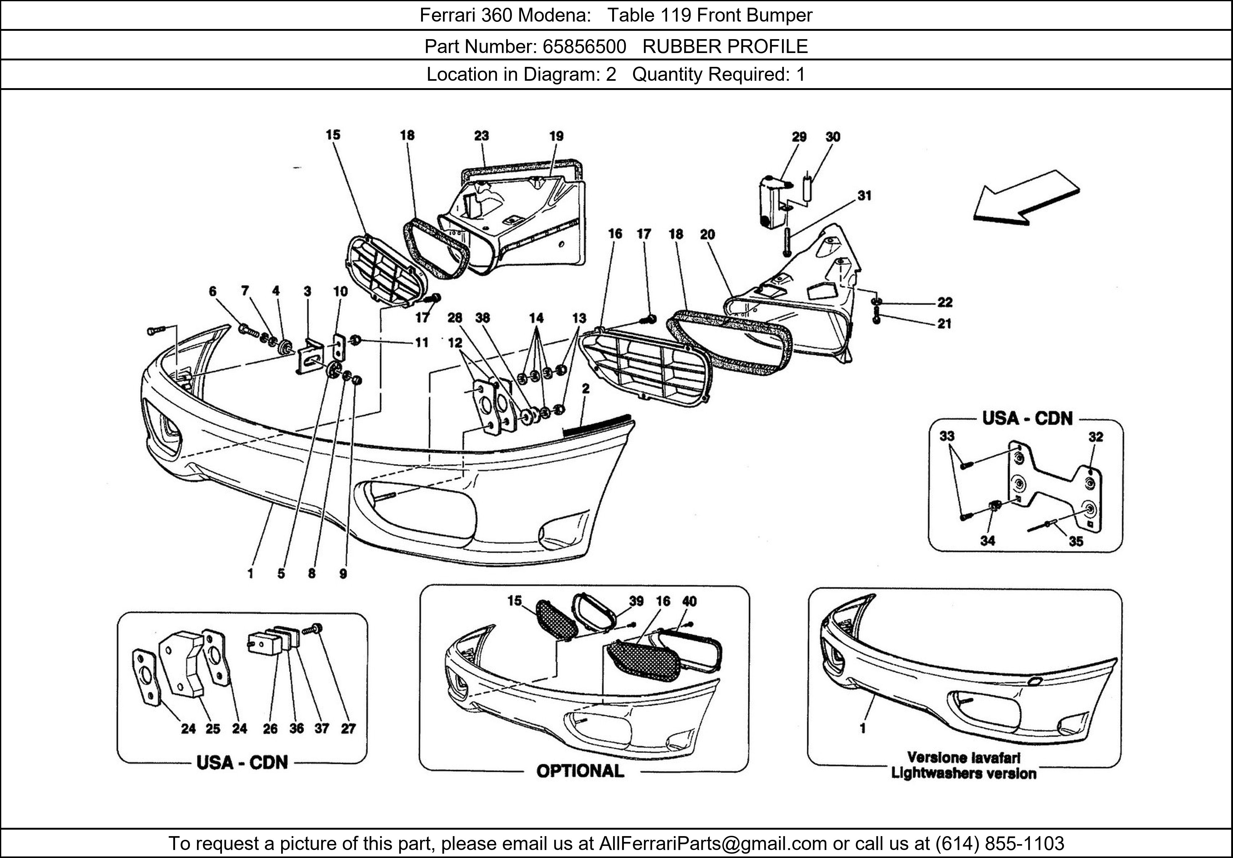Ferrari Part 65856500, RUBBER PROFILE, shown here as used in Ferrari 360 Modena Table 119 Front Bumper. Other uses of this part are shown below: