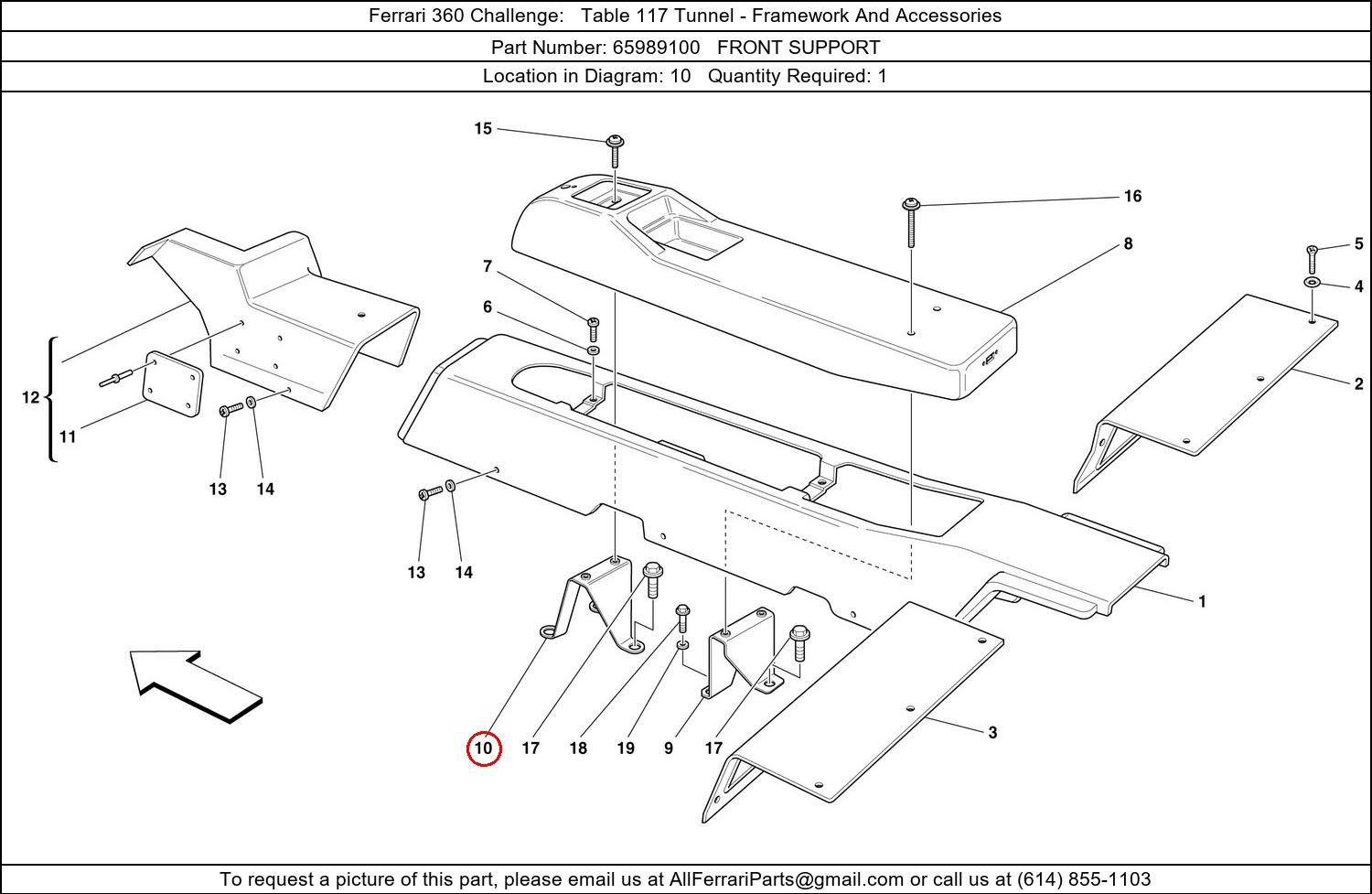 Ferrari Part Number 65989100, FRONT SUPPORT shown here as used in Ferrari 360 Challenge Table 117 Tunnel - Framework And Accessories. Location in Diagram: 10. Required Quantity: 1