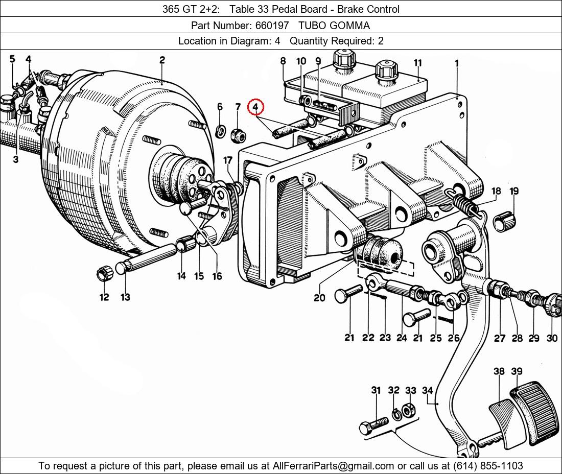 Ferrari Part Number 660197, TUBO GOMMA shown here as used in 365 GT 2+2 Table 33 Pedal Board - Brake Control. Location in Diagram: 4. Required Quantity: 2. This Ferrari part is used in more than one diagram. Click on the diagrams below to see alternative uses of this part: