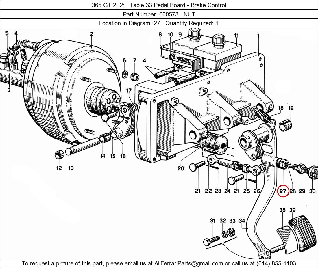 Ferrari Part Number 660573, NUT shown here as used in 365 GT 2+2 Table 33 Pedal Board - Brake Control. Location in Diagram: 27. Required Quantity: 1
