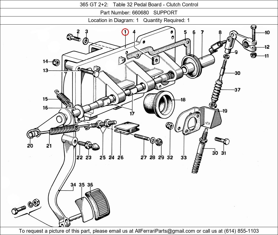 Ferrari Part Number 660680, SUPPORT shown here as used in 365 GT 2+2 Table 32 Pedal Board - Clutch Control. Location in Diagram: 1. Required Quantity: 1. This Ferrari part is used in more than one diagram. Click on the diagrams below to see alternative uses of this part: