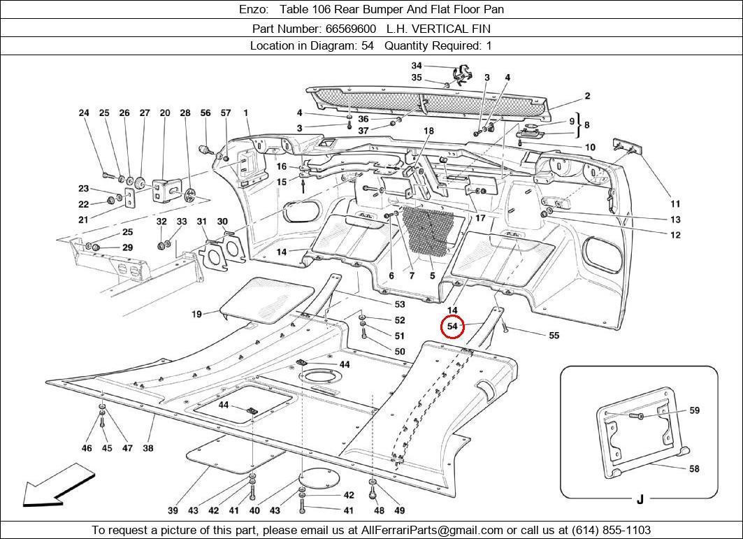 Ferrari Part Number 66569600, L.H. VERTICAL FIN shown here as used in Enzo Table 106 Rear Bumper And Flat Floor Pan. Location in Diagram: 54. Required Quantity: 1