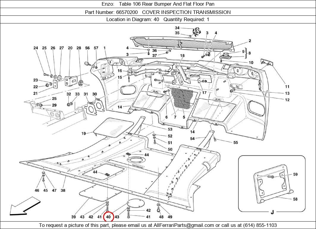 Ferrari Part Number 66570200, COVER INSPECTION TRANSMISSION shown here as used in Enzo Table 106 Rear Bumper And Flat Floor Pan. Location in Diagram: 40. Required Quantity: 1