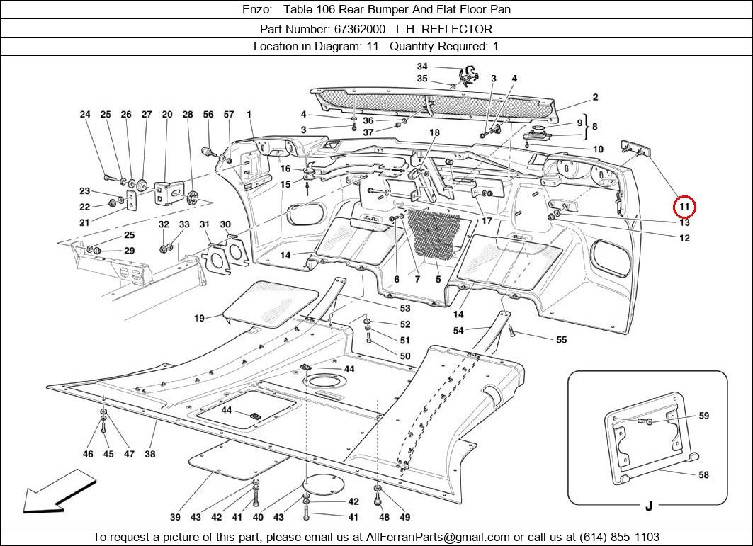 Ferrari Part Number 67362000, L.H. REFLECTOR shown here as used in Enzo Table 106 Rear Bumper And Flat Floor Pan. Location in Diagram: 11. Required Quantity: 1
