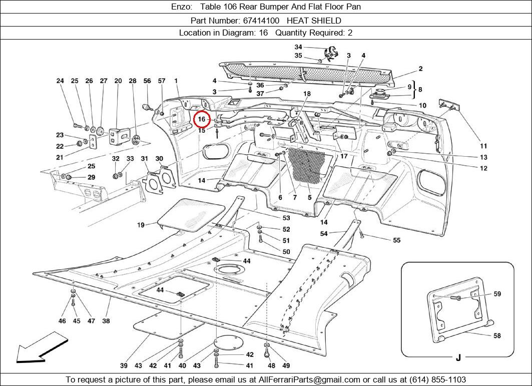 Ferrari Part Number 67414100, HEAT SHIELD shown here as used in Enzo Table 106 Rear Bumper And Flat Floor Pan. Location in Diagram: 16. Required Quantity: 2