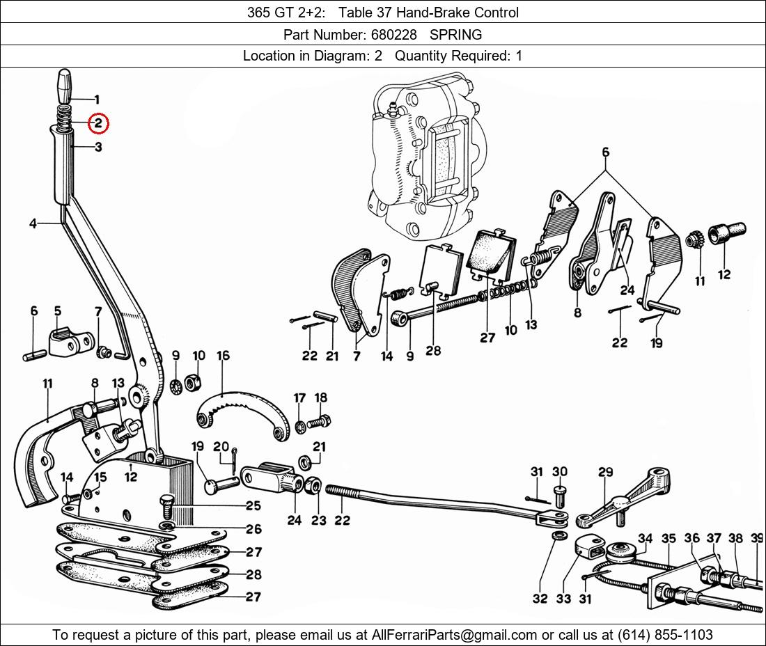 Ferrari Part Number 680228, SPRING shown here as used in 365 GT 2+2 Table 37 Hand-Brake Control. Location in Diagram: 2. Required Quantity: 1