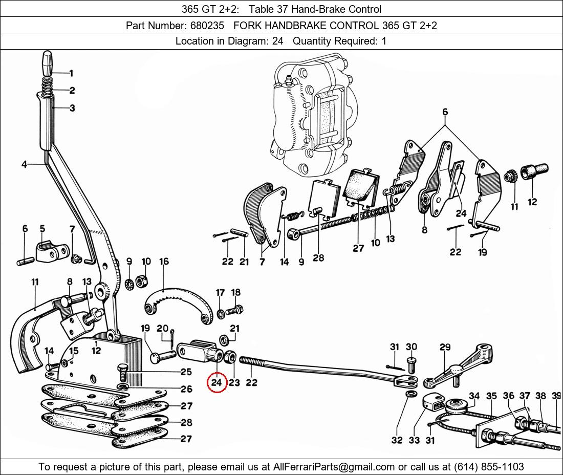 Ferrari Part Number 680235, FORK HANDBRAKE CONTROL 365 GT 2+2 shown here as used in 365 GT 2+2 Table 37 Hand-Brake Control. Location in Diagram: 24. Required Quantity: 1. This Ferrari part is used in more than one diagram. Click on the diagrams below to see alternative uses of this part: