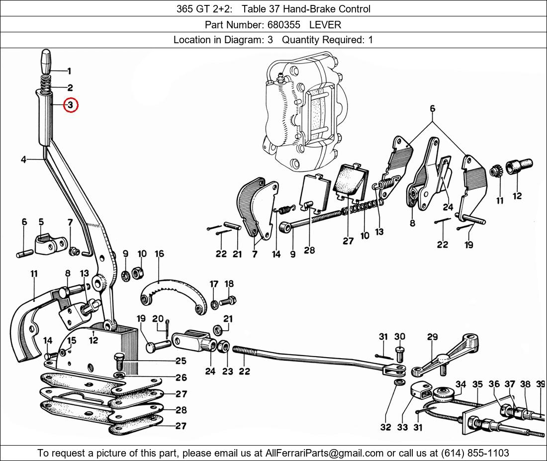 Ferrari Part Number 680355, LEVER shown here as used in 365 GT 2+2 Table 37 Hand-Brake Control. Location in Diagram: 3. Required Quantity: 1