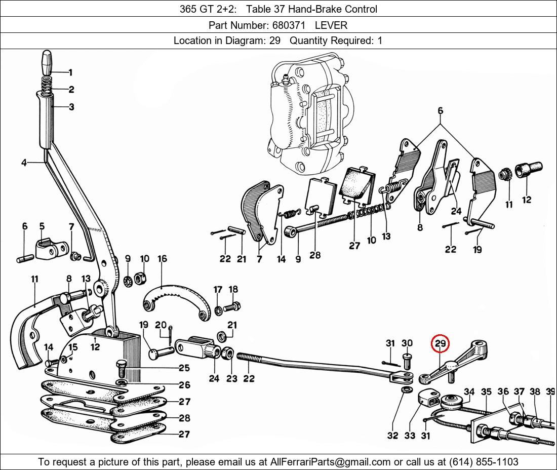 Ferrari Part Number 680371, LEVER shown here as used in 365 GT 2+2 Table 37 Hand-Brake Control. Location in Diagram: 29. Required Quantity: 1
