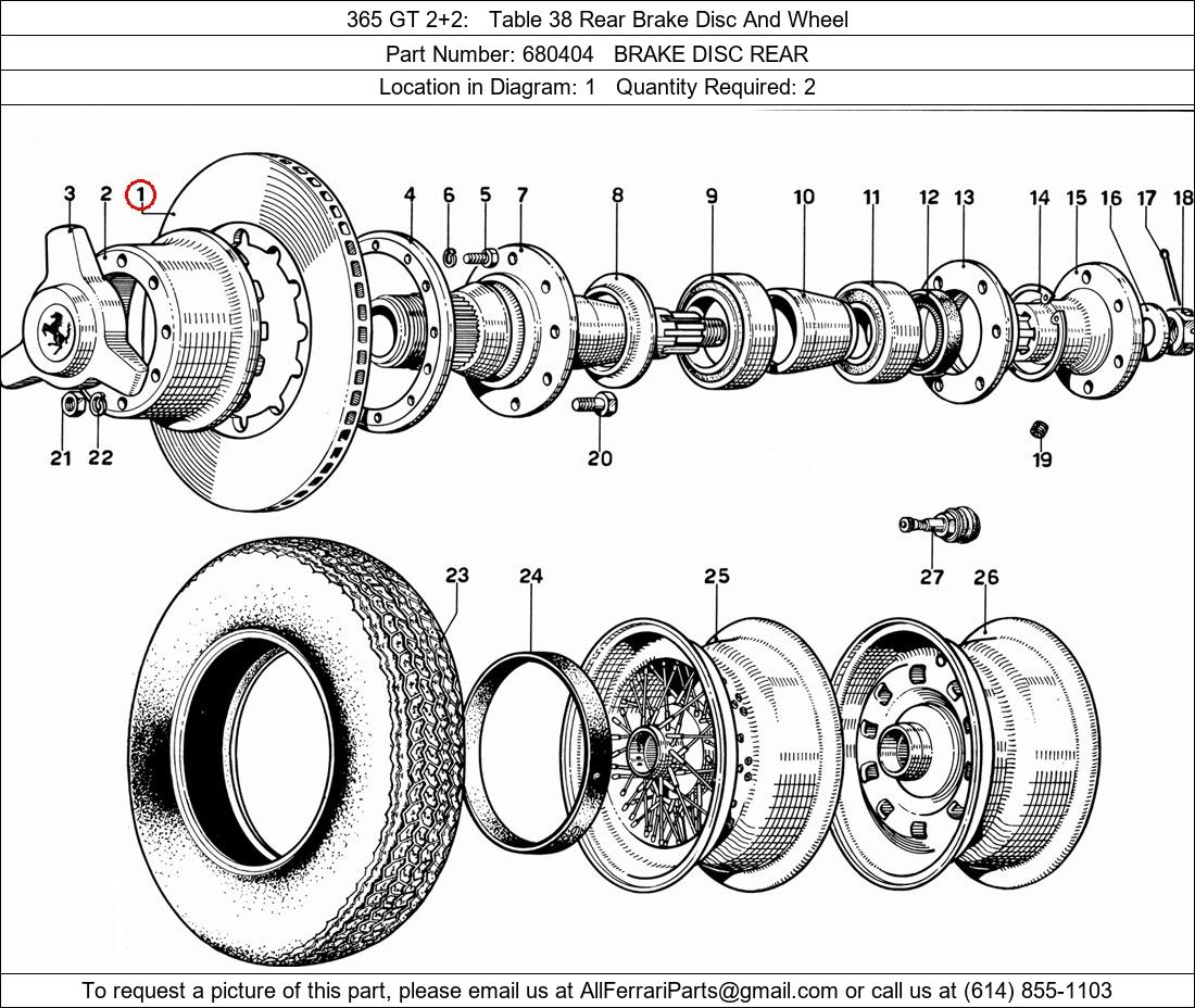 Ferrari Part Number 680404, BRAKE DISC REAR shown here as used in 365 GT 2+2 Table 38 Rear Brake Disc And Wheel. Location in Diagram: 1. Required Quantity: 2