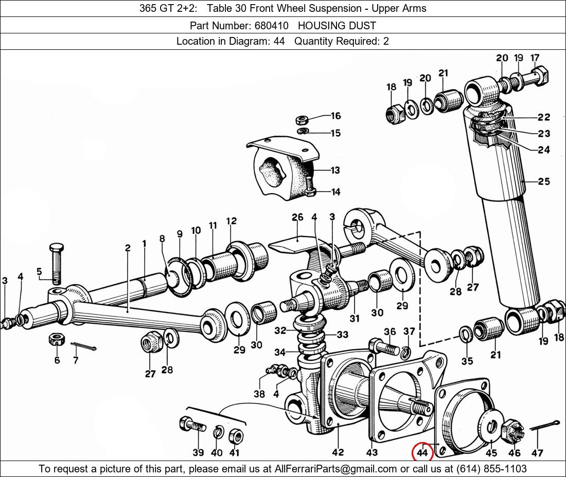 Ferrari Part Number 680410, HOUSING DUST shown here as used in 365 GT 2+2 Table 30 Front Wheel Suspension - Upper Arms. Location in Diagram: 44. Required Quantity: 2