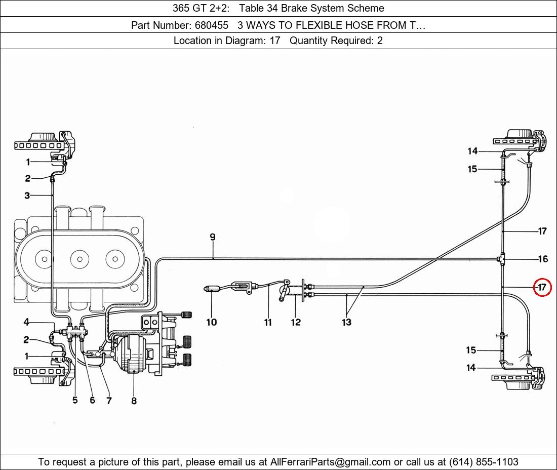 Ferrari Part Number 680455, 3 WAYS TO FLEXIBLE HOSE FROM T… shown here as used in 365 GT 2+2 Table 34 Brake System Scheme. Location in Diagram: 17. Required Quantity: 2