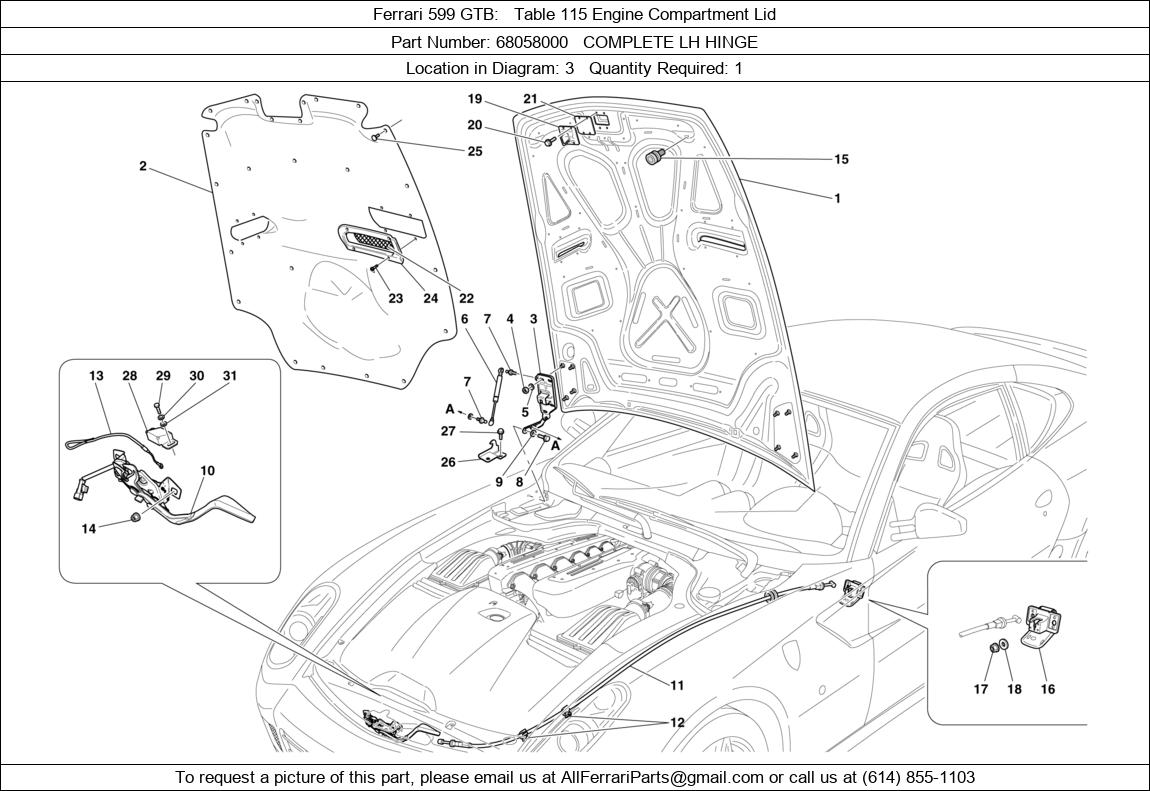 Ferrari Part 68058000, COMPLETE LH HINGE, shown here as used in Ferrari 599 GTB Table 115 Engine Compartment Lid. Other uses of this part are shown below: