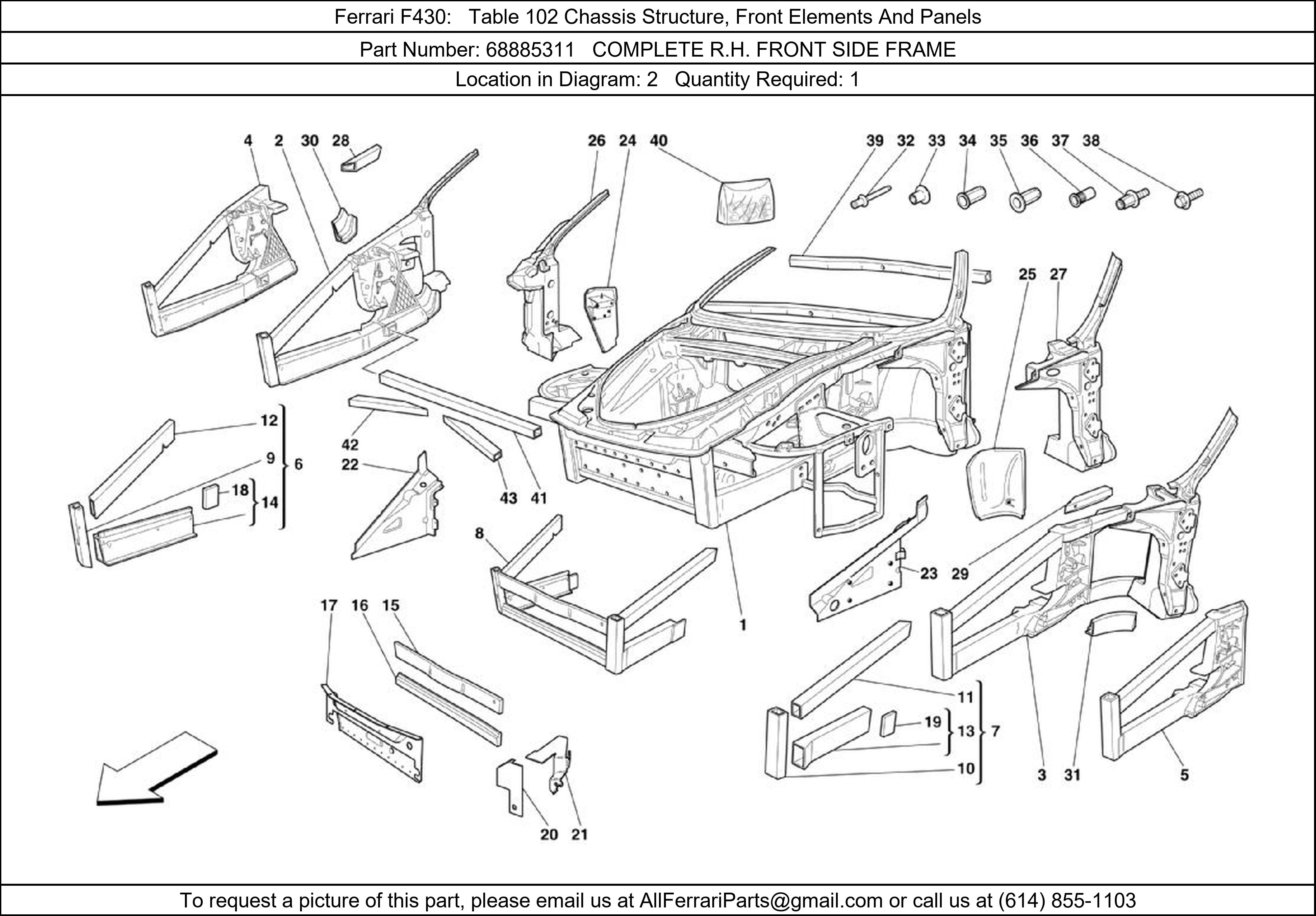 Ferrari Part 68885311, COMPLETE R.H. FRONT SIDE FRAME, shown here as used in Ferrari F430 Table 102 Chassis Structure, Front Elements And Panels. Other uses of this part are shown below:
