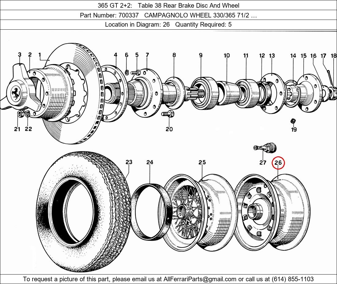Ferrari Part Number 700337, CAMPAGNOLO WHEEL 330/365 71/2 … shown here as used in 365 GT 2+2 Table 38 Rear Brake Disc And Wheel. Location in Diagram: 26. Required Quantity: 5. This Ferrari part is used in more than one diagram. Click on the diagrams below to see alternative uses of this part: