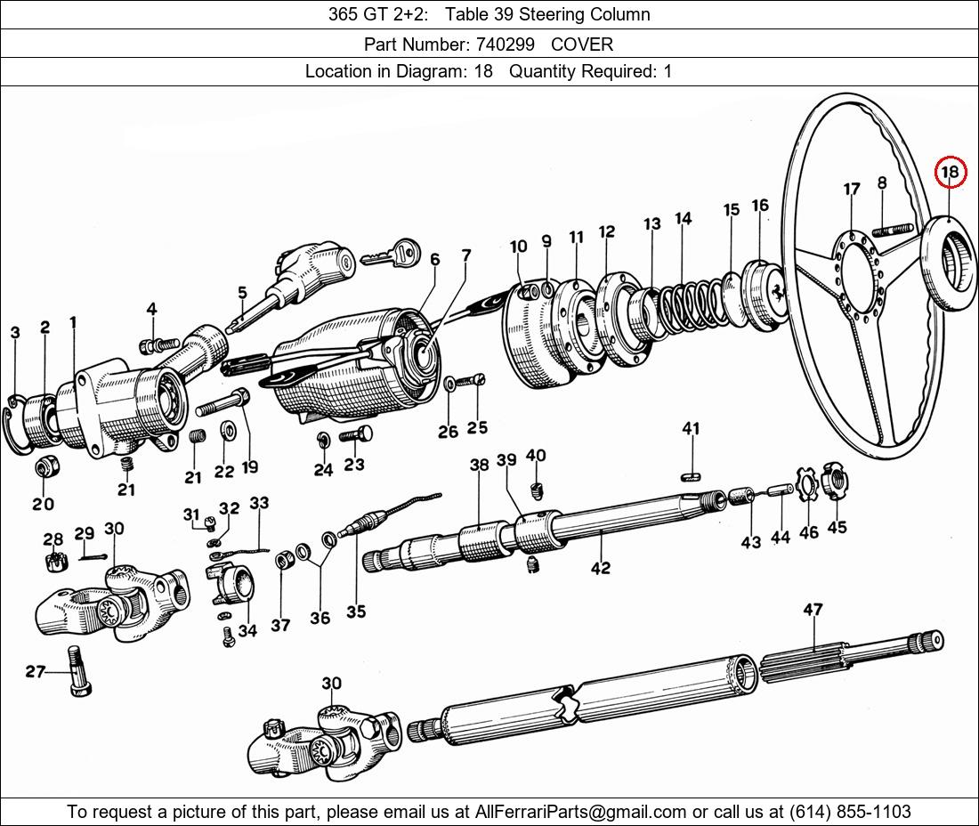 Ferrari Part Number 740299, COVER shown here as used in 365 GT 2+2 Table 39 Steering Column. Location in Diagram: 18. Required Quantity: 1. This Ferrari part is used in more than one diagram. Click on the diagrams below to see alternative uses of this part: