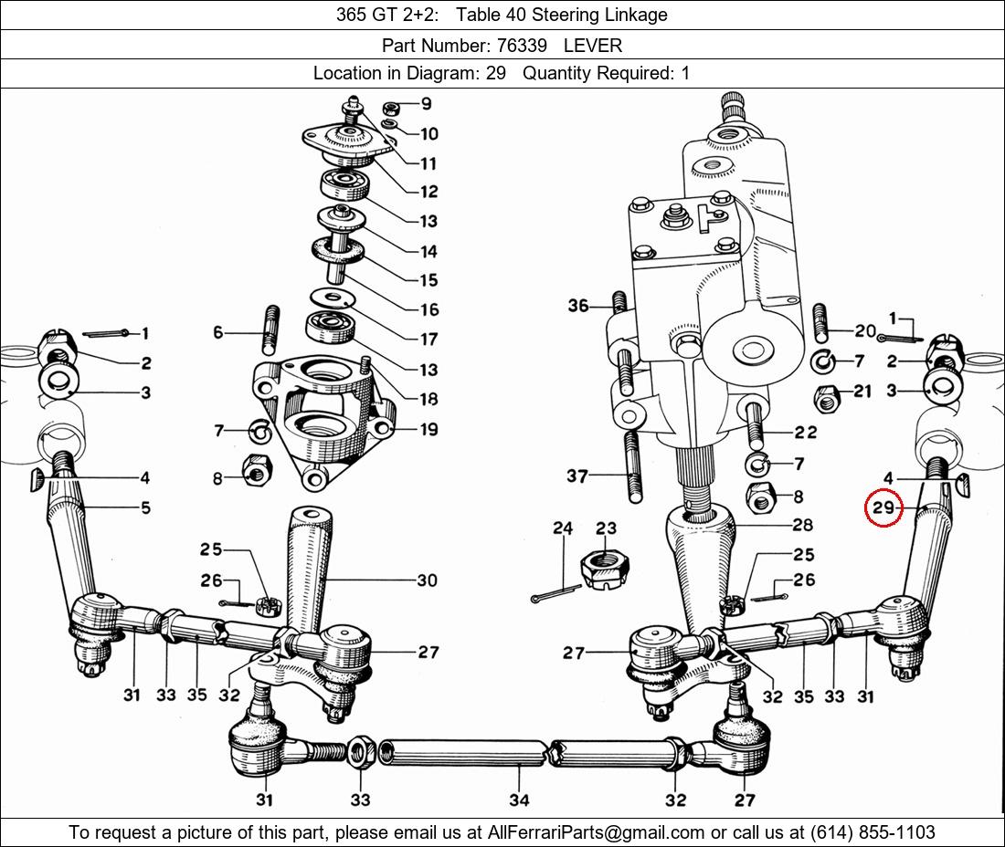 Ferrari Part Number 76339, LEVER shown here as used in 365 GT 2+2 Table 40 Steering Linkage. Location in Diagram: 29. Required Quantity: 1. This Ferrari part is used in more than one diagram. Click on the diagrams below to see alternative uses of this part:
