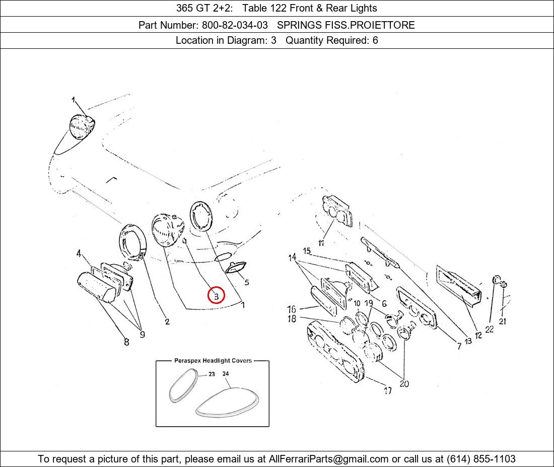 Ferrari Part Number 800-82-034-03, SPRINGS FISS.PROIETTORE shown here as used in 365 GT 2+2 Table 122 Front & Rear Lights. Location in Diagram: 3. Required Quantity: 6