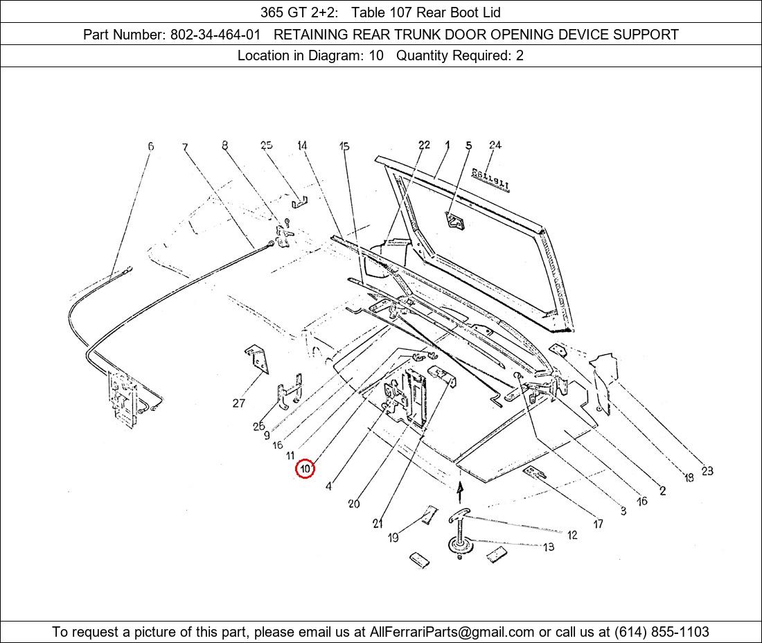 Ferrari Part Number 802-34-464-01, RETAINING REAR TRUNK DOOR OPENING DEVICE SUPPORT shown here as used in 365 GT 2+2 Table 107 Rear Boot Lid. Location in Diagram: 10. Required Quantity: 2