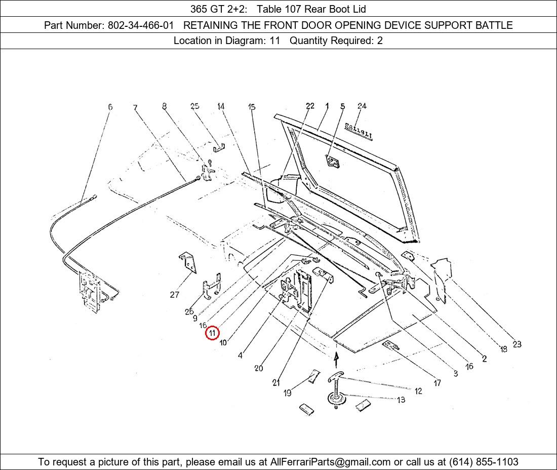 Ferrari Part Number 802-34-466-01, RETAINING THE FRONT DOOR OPENING DEVICE SUPPORT BATTLE shown here as used in 365 GT 2+2 Table 107 Rear Boot Lid. Location in Diagram: 11. Required Quantity: 2