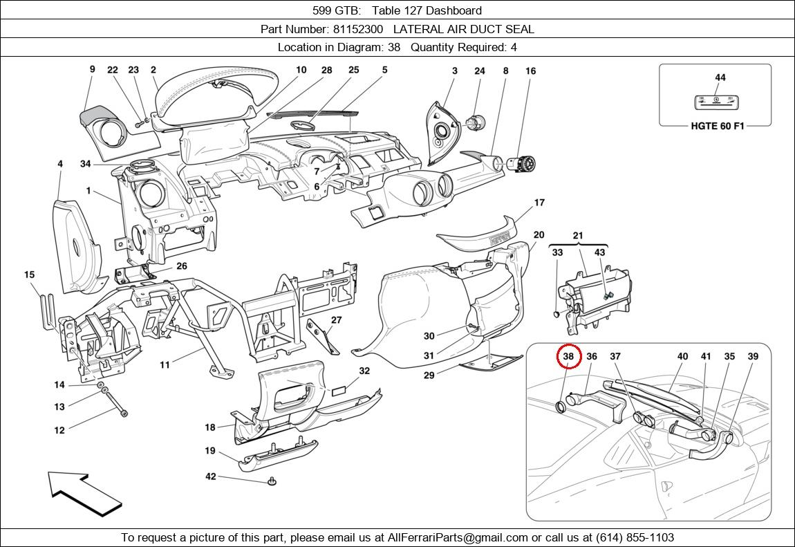 Ferrari Part Number 81152300, LATERAL AIR DUCT SEAL shown here as used in 599 GTB Table 127 Dashboard. Location in Diagram: 38. Required Quantity: 4. This Ferrari part is used in more than one diagram. Click on the diagrams below to see alternative uses of this part: